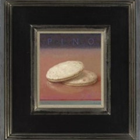 Rein Pol: Stilleven met witte eierkoeken van bakker Pino. ‘De bekende Sneeker bakkersfamilie Pino werd als zoveel anderen weggevoerd en keerde niet meer terug. Daarom schilder ik als een hommage hun heerlijke, ook op zondag verkrijgbare, witte eierkoeken -een stilleven- of is het een oneindig landschap…’