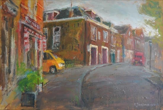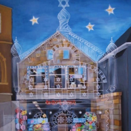 Rita Vjodorowa: ‘Als een heiligdom niet meer bestaat, blijft er nog altijd iets bestaan van de heiligheid van de plaats’ aldus een oude Joodse spreuk. Rita, een geboren Oekraïense, vond inspiratie in die spreuk en maakte het schilderij Imagine. Twee beelden over elkaar: de oude synagoge en het winkelpand dat ervoor in de plaats kwam.